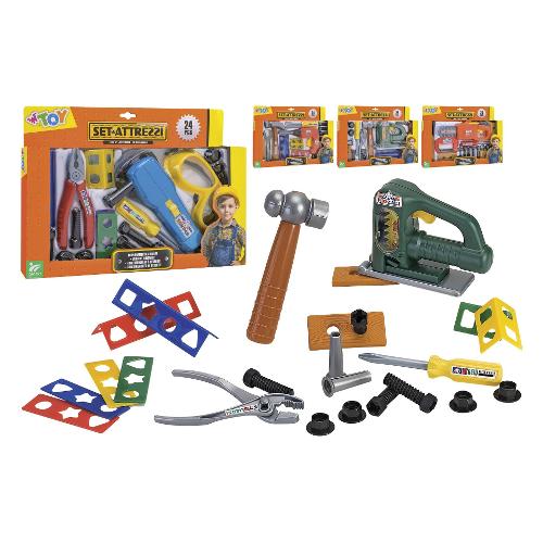 Set attrezzi da lavoro con funzionamento a molla: cacciaviti, pinze, seghetto, metro e tanti altri accessori per diventare un vero meccanico. 24 pezzi. Disponibili in 4 assorititi.