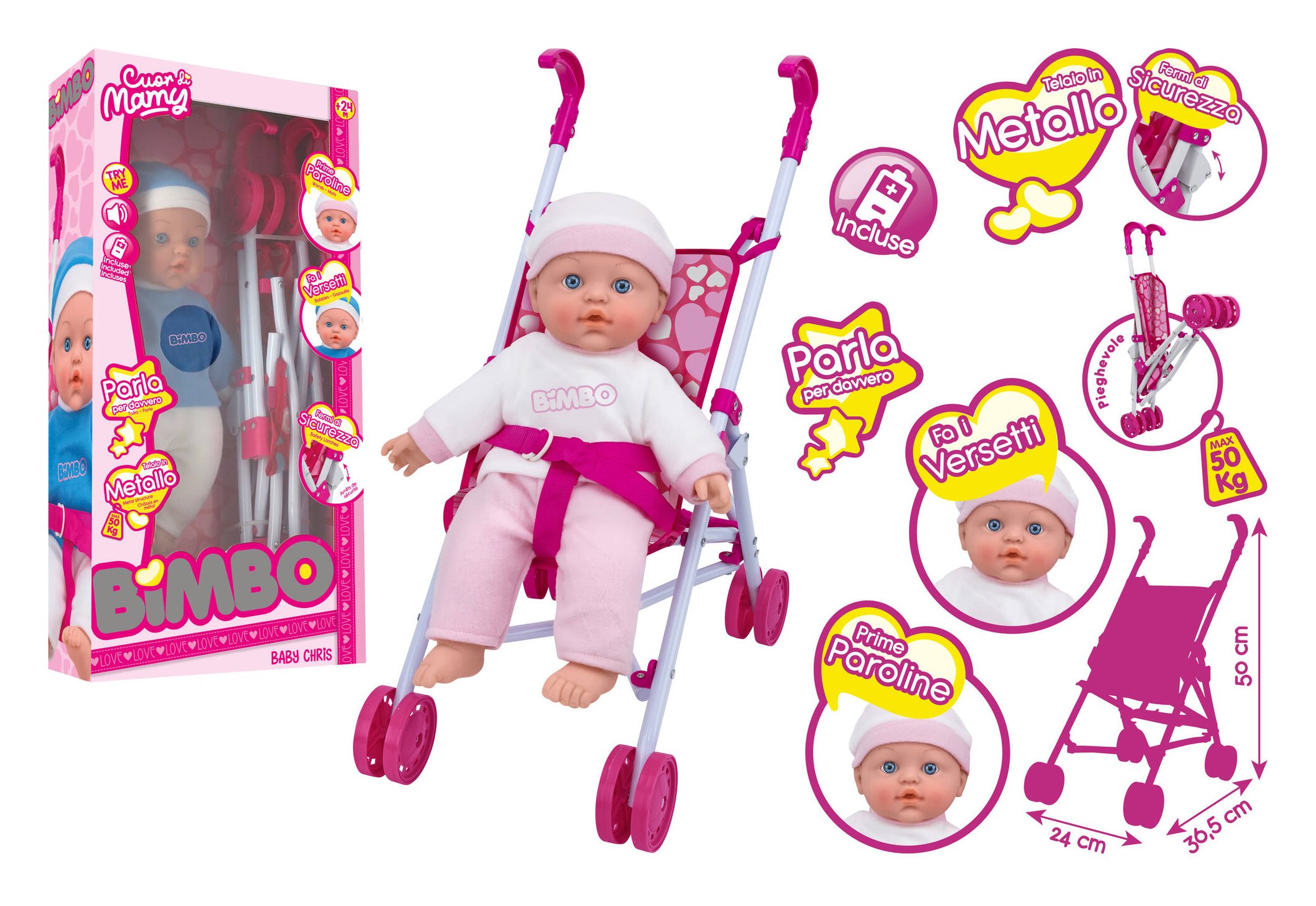 Maxi playset composto da Baby Chris, bambola interattiva di 41 cm, e passeggino pieghevole dalla robusta struttura in metallo e dal rivestimento in romantica stoffa. Baby Chris parla per davvero, emette simpatici versetti e le prime paroline. Funzionante a batterie incluse, renderà il momento di gioco davvero unico. Dimensioni del passeggino: L 24 x P36,6 x H 50 cm. Portata max 50 Kg. Prodotto testato e sicuro. Dotato di fermi di sicurezza.
