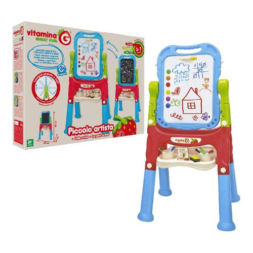 Colorata lavagna magnetica da terra, multifunzione, con treppiede, e vano porta oggetti. Il pannello, grazie alla rotazione completa di 360° si trasforma da lavagna magnetica a lavagna tradizionale sulla quale colorare con i gessetti colorati. Inclusi 48 accessori per liberare la fantasia e l'immaginazione. Dimensioni: l50 x h86 x p36 cm. Ideale per bambini dai 3 anni +. Stimola creatività, coordinazione occhio-mano, vista e tatto.
