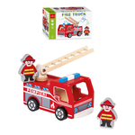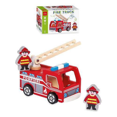 La versione giocattolo di un autopompa con scala e due personaggi. Le ruote funzionanti, la scala girevole e i