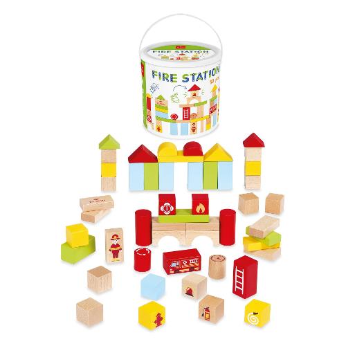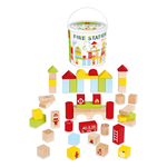 50 elementi in legno che permettono ai bambini di costruire la loro stazione dei pompieri o dare vita a