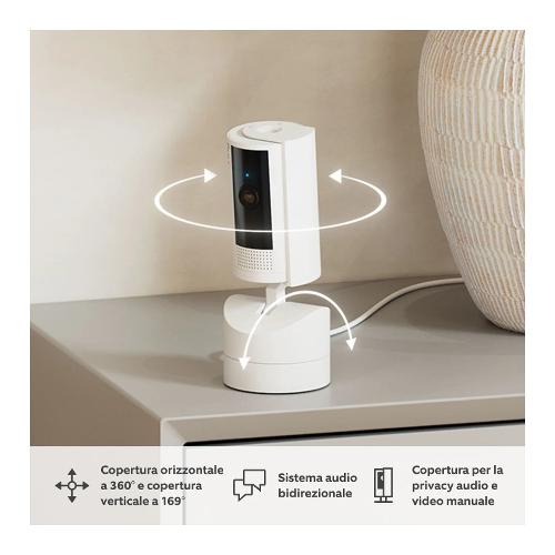 Scopri la nostra prima videocamera di sicurezza, controllata dal telefono, che offre una copertura orizzontale a 360° e una copertura verticale a 169° in ogni stanza. Con la Videocamera interna inclinabile puoi regolare l'angolazione per tenere d'occhio i tuoi bambini o animali domestici, il tutto dall'app Ring. Basta collegarla, posizionarla dove serve e ruotarla e inclinarla fino a trovare l'angolazione perfetta. Facile. Sentiti al sicuro sapendo che la privacy della tua casa è protetta grazie a funzioni attentamente studiate che ti consentono di avere il controllo sull'attivazione di Pan-Tilt Indoor Camera e di decidere chi può accedere allo streaming.