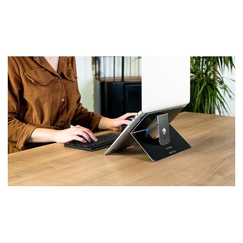 Questo supporto per laptop si attacca semplicemente al retro del tuo laptop con il velcro. Poiché è collegato al tuo laptop, non dimenticherai mai di portare il supporto con te. Così lavori ovunque con una postura sana!