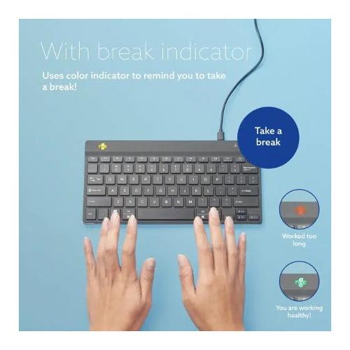 La tastiera R-Go Compact Break include un indicatore di tempo sotto forma di luce LED. Questo è controllato direttamente dal software R-Go Break. L'indicatore mostra quanto stai lavorando in modo sano e cambia colore, come un semaforo. Quando la luce diventa verde, significa che stai lavorando in modo sano. L'arancione indica che è ora di fare una breve pausa e il rosso indica che hai saltato una pausa.
