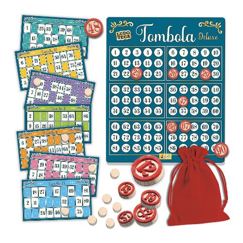 Una tombola esclusiva, realizzata con materiali di alta qualità. Grazie i numeri e i gettoni realizzati in legno naturale e lo speciale sacchetto