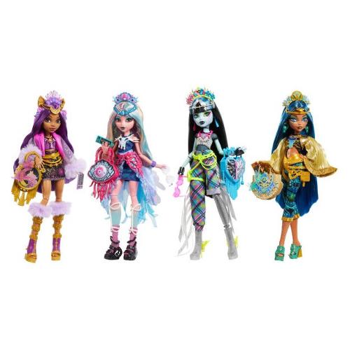 Le bambole monster high sono invitate al monster fest, il festival musicale più cool del mondo! Dotate di outfit e accessori da urlo, non vedono l'ora di mangiare, ballare e spaventare! Frankie stein, clawdeen wolf, cleo de nile e lagoona blue sfoggiano abiti mostruosamente eleganti, completi di cerchietti mozzafiato per scatenarsi sul palco! Che stiano cantando in mezzo alla folla o esibendosi con la mostruosa troupe, i loro outfit da concerto catturano l'attenzione con dettagli di lusso come vistosi gioielli, finiture testurizzate e cinture d'impatto. Una delle parti migliori di qualsiasi festival è il cibo! Le mostramiche non vedono l'ora di sorseggiare bibite da brivido e di gustare spuntini come nachos lunari, hamburger con tentacoli e molto altro. Ogni bambola viene fornita con una macchina fotografica per immortalare pose da urlo! Accessori a tema, come il braccialetto, il poster della band e altro ancora, ispirano storie a tema festival musicale.