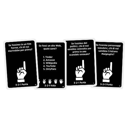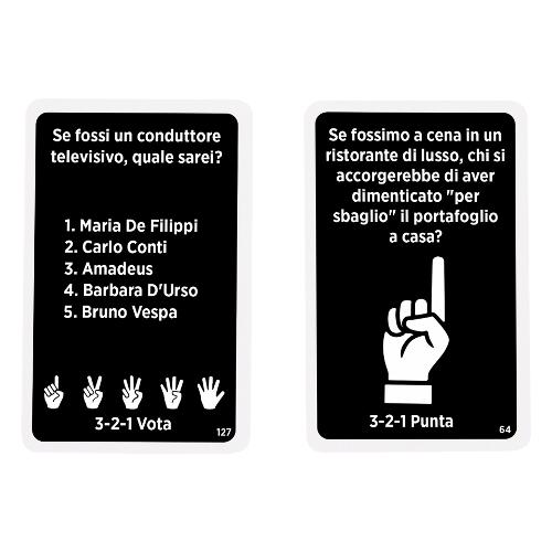 E se fossi... è un gioco divertentissimo e semplice da imparare per le serate di gioco tra adulti! Il giocatore attivo pone domande ridicole e l'intero gruppo vota. La maggioranza vince e tutti i vincitori ottengono un punto! Ci sono due tipi di carte: a scelta multipla, in cui i giocatori votano con le dita (da 1 a 5), e a singola domanda, in cui le dita sono puntate sugli altri giocatori. In questo gioco per adulti, i giocatori pongono domande ridicole, come ad esempio: chi è più probabile che 'venga fatto fuori per primo' in un film horror o che 'subisca il primo scandalo sessuale' in politica. Le ruote punteggio aiutano i giocatori a tenere facilmente traccia dei punti e a vantarsi senza vergogna di quanto conoscono bene i loro amici.