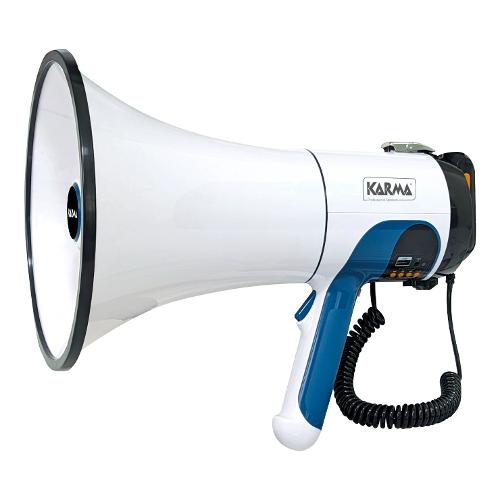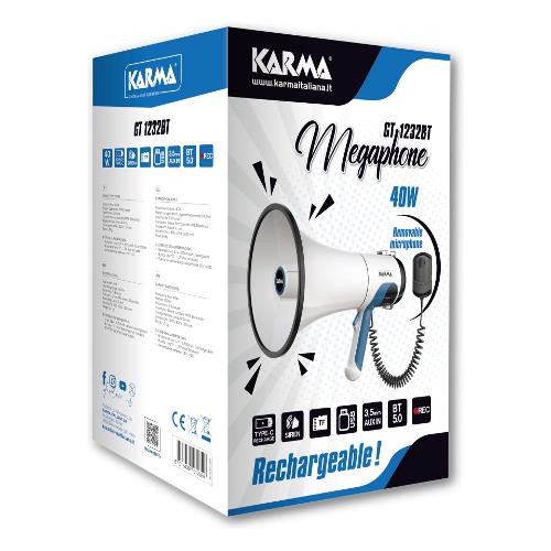 Di grande potenza è in grado di amplificare la voce rendendola udibile ad una distanza di oltre 1 Km. E' alimentato da una batteria ricaricabile al litio da 11,1V - 2200mAh ma all'occorrenza è possibile utilizzare anche normali batterie di tipo C. Si può utilizzare anche un caricatore esterno 12V non incluso. Presenta un microfono con cavo spiralato agganciato al megafono che può essere utilizzato anche per la massima comodità. Sul Microfono è presente il tasto di accensione e la rotellina controllo volume. Oltre alla voce può amplificare dei messaggi registrati nella memoria interna (fino a 15 minuti), memorizzati in chiavette o schede micro SD ma anche provenienti da uno smarphone tramite bluetooth. Dispone anche di una presa 3,5mm per segnale esterno.