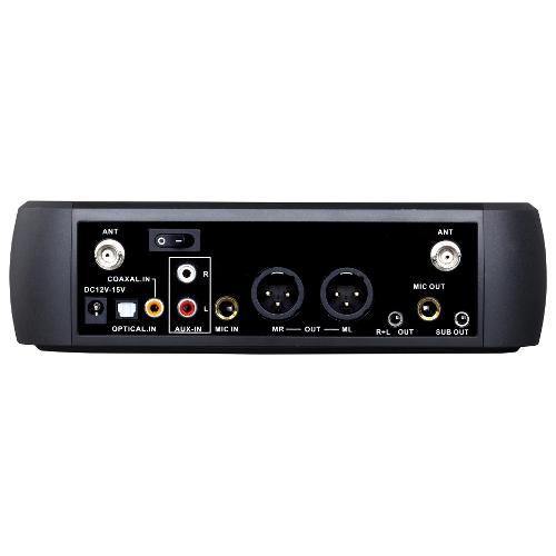 Apparecchio unico nel suo genere. Una sorta di mixer dove è possibile collegare un microfono a filo, un segnale ottico, uno coassiale e un ingresso di linea tramite connettori RCA. In uscita invece avrete a disposizione connettori XLR, 3,5mm, connettore 6,3mm per microfono e persino un connettore 3,5mm destinato ad un subwoofer esterno. L'apparecchio gestisce due radiomicrofoni UHF a 50 canali (range 573.50 -594.90 Mhz) e incorpora una ricevente bluetooth.