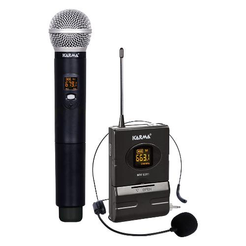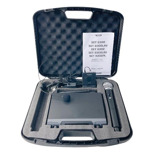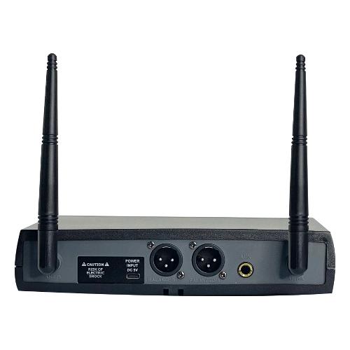 Radiomicrofono compatto ed efficiente comprensivo di doppio radiomicrofono: uno palmare e l'altro da cintura con microfono ad archetto. Dispone di 48 canali per poter operare in ogni condizione. La portata è di circa 50mt con ottima resa acustica sia sul parlato che nel canto. La base ricevente possiede 2 prese di tipo XLR indipendenti per ogni canale e una presa mixata di tipo 6,3mm. E' alimentabile da una normale presa USB e presenta ampio display che mostra tutte le principali informazioni. Il sistema easy change consente di cambiare canale con la semplice pressione di un tasto del microfono. I microfoni sono alimentati da 2 batterie stilo (non incluse).