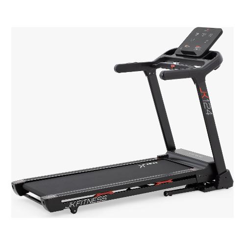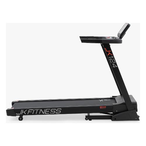 Il jk 124 è un tapis roulant elettrico di fascia media nel mondo home fitness equipaggiato con un potente motore da 2.75 hp con un picco massimo di 3.75 hp che permette di raggiungere una velocità di 20 km/h, con regolazione ad incrementi one-step di 0,1 km/h. Il jk 124 è dotato di una inclinazione elettrica su 18 livelli, che permette di raggiungere una pendenza del 12 % per stimolanti camminate in salita. Per la massima praticità dell’utilizzatore il jk 124 è dotato di una serie di pulsanti a comando rapido per velocità ed inclinazione, pratici per far eseguire repentine variazioni della prestazione all’utilizzatore senza distrazioni. L’ampia superficie di corsa di 46 x 142 cm, con nastro spesso 1,6 mm anti-slip, permette confortevoli allenamenti in piena sicurezza grazie anche al sistema di ammortizzazione flex system, che riesce a limitare i piccoli microtraumi dovuti all’impatto del piede durante la camminata e la corsa. Il quadro di comando del nuovo jk 124 è suddiviso su due distinti elementi; una grande console con 5 display a led bianchi e una matrice grafica 8 x 16 pxl, per mantenere sotto controllo tutti i parametri dell’allenamento cardio quali: tempo, distanza, velocità, inclinazione, calorie bruciate, n° passi, frequenza cardiaca, matrice grafica per visualizzazione profilo programma; una console secondaria multifunzione, start-stop e display con led bianco che visualizza tempo, distanza, calorie, inclinazione e velocità. Il tapis roulant jk 124 è dotato di due ricevitori integrati: per collegare i propri devices elettronici (app, social e musica); e 5.3 kh per la rilevazione della frequenza cardiaca tramite la fascia cardio toracica offerta di serie. Il tapis roulant jk 124 per essere più vicino alle esigenze e necessità di ogni utilizzatore, è equipaggiato con una serie di programmi per rendere ogni allenamento, il “tuo” allenamento! Sono in dotazione: 1 programma manuale dove tutte le funzioni sono interamente gestite dall’utilizzatore in ogni momento; 3 programmi a target con obiettivi predeterminati per un tempo, una distanza, un consumo di calorie; 12 programmi pre-impostati con la variazione combinata fra velocità ed inclinazione; 3 hrc target determinato dall’utente della frequenza cardiaca personale; 1 body fat test, utile a comprendere la proprio indice di massa corporea. La console è dotata di due casse audio hi-fi, due vani porta borraccia/oggetti, un ingresso audio usb, ingresso audio jack, una uscita usb per ricaricare i propri devices durante l’allenamento. E’ possibile connettere alcune app più motivanti e divertenti per rendere le sessioni di allenamento meno monotone, quali: zwift, kinomap (abbonamenti non inclusi).