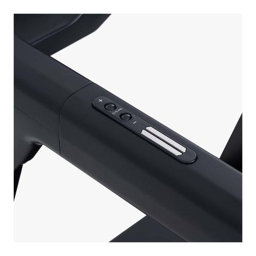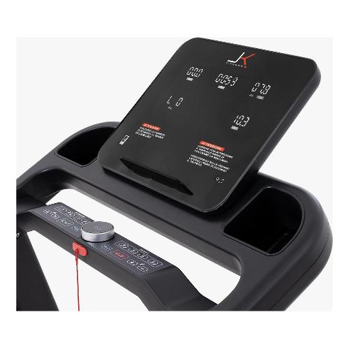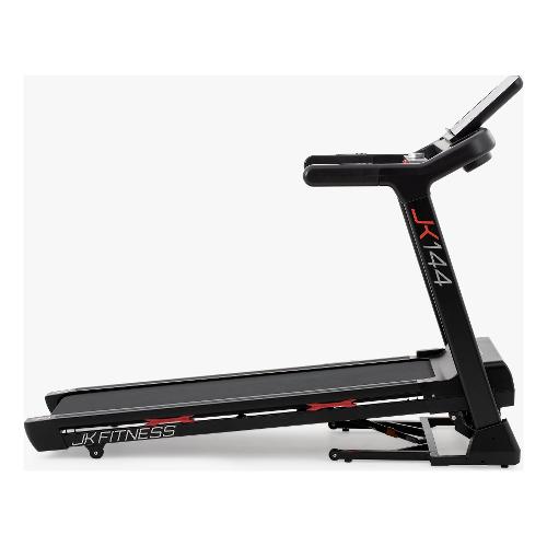 Il jk 144 è un tapis roulant elettrico di fascia media nel mondo home fitness equipaggiato con un potente motore da 3.25 hp con un picco massimo di 4.25 hp che permette di raggiungere una velocità di 22 km/h, con regolazione ad incrementi one-step di 0,1 km/h. Il jk 144 è dotato di una inclinazione elettrica su 20 livelli, che permette di raggiungere una pendenza del 12% per stimolanti camminate in salita. Per la massima facilità d’uso dell’utilizzatore il jk 144 è dotato di una serie di pulsanti a comando rapido per velocità ed inclinazione, pratici per far eseguire repentine variazioni della prestazione all’utilizzatore senza distrazioni. L’ampia superficie di corsa di 48 x 149 cm, con nastro spesso 1,6 mm anti-slip, permette confortevoli allenamenti in piena sicurezza grazie anche al sistema di ammortizzazione comfort flex system con 4 elastomeri a x, che riesce a limitare i piccoli microtraumi dovuti all’impatto del piede durante la camminata e la corsa. Il quadro di comando del nuovo jk 144 è suddiviso su due distinti elementi; una grande console con 5 display a led bianchi e una matrice grafica 8 x 16 pxl, per tenere sotto controllo tutti i parametri dell’allenamento cardio quali: tempo, distanza, velocità, inclinazione, calorie bruciate, n° passi, frequenza cardiaca, matrice grafica per visualizzazione profilo programma; una console secondaria multifunzione, start-stop e display con doppio led bianco che visualizza tempo, distanza, calorie, inclinazione e velocità. Il tapis roulant jk 144 è dotato di due ricevitori integrati: per collegare i propri devices elettronici (app, social e musica); e 5.3 kh per la rilevazione della frequenza cardiaca tramite la fascia cardio toracica offerta di serie. Il tapis roulant jk 144 si adatta perfettamente alle esigenze e necessità di ogni utilizzatore, è equipaggiato con una serie di programmi per rendere ogni allenamento completamente personalizzato! Sono in dotazione: 1 programma manuale dove tutte le funzioni sono interamente gestite dall’utilizzatore in ogni momento; 3 programmi a target con obiettivi pre-determinati per un tempo, una distanza, il consumo di calorie; 70 programmi pre-impostati con la variazione combinata fra velocità ed inclinazione; hrc target determinato dall’utente della frequenza cardiaca personale; 5 user programmi personalizzabili dall’utilizzatore stesso, ovvero bisogna impostare ogni singolo step del programma determinando velocità ed inclinazione; 1 body fat test, utile a comprendere la proprio indice di massa corporea. La console è dotata di due casse audio hi-fi, due vani porta borraccia/oggetti, un ingresso audio usb, ingresso audio jack, una uscita usb per ricaricare i propri dispositivi durante l’allenamento. E’ possibile connettere alcune app divertenti per rendere le sessioni di allenamento interattivo, quali: zwift, kinomap (abbonamenti non inclusi).