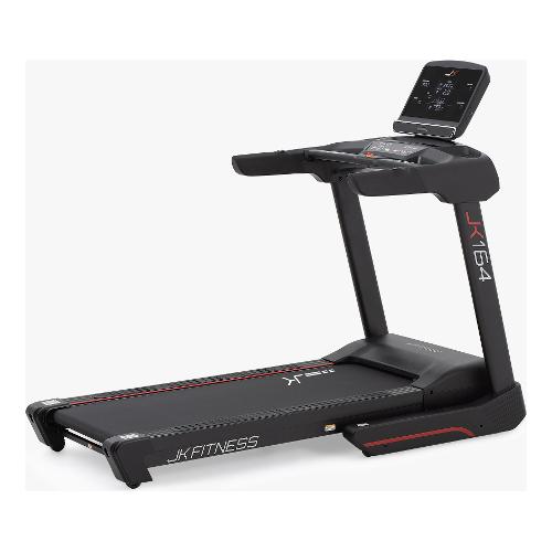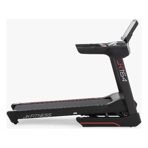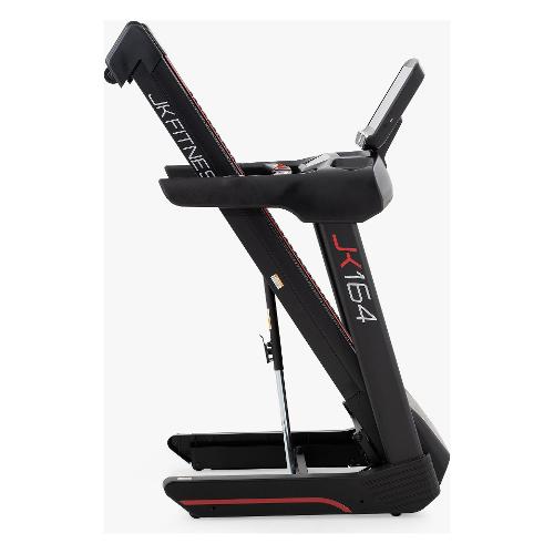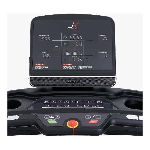 Il jk 164 è un tapis roulant elettrico di fascia medio-alta nel mondo home fitness equipaggiato con un potente motore da 3.5 hp con un picco massimo di 4.5 hp che permette di raggiungere una velocità di 22 km/h, con regolazione ad incrementi one-step di 0,1 km/h. Il jk 164 è dotato di una inclinazione elettrica su 15 livelli, che permette di raggiungere una pendenza max pari al 15%. Per la massima facilità d’uso dell’utilizzatore il jk 164 è dotato di una serie di pulsanti rapidi per velocità ed inclinazione, pratici per far eseguire rapide modifiche della prestazione all’utilizzatore senza distrazioni. L’ampia superficie di corsa di 51 x 150 cm, con nastro spesso 1,6 mm anti-slip, permette confortevoli allenamenti in totale sicurezza grazie anche al sistema di ammortizzazione comfort flex system, che riesce a ridurre i piccoli microtraumi dovuti all’impatto del piede durante la camminata e la corsa. Il quadro di comando del nuovo jk 164 è composto da una grande console con 8 display a led bianchi e una matrice grafica 8 x 16 pxl, per mantenere sotto controllo tutti i parametri dell’allenamento cardio quali: tempo, distanza, velocità, inclinazione, calorie bruciate, n° passi, frequenza cardiaca, matrice grafica per visualizzazione profilo programma. Il tapis roulant jk 164 è dotato di due ricevitori integrati per collegare i propri devices elettronici (app, social e musica); e 5.3 kh per la rilevazione della frequenza cardiaca tramite la fascia cardio toracica offerta di serie. Il tapis roulant jk 164 per essere più vicino alle esigenze e necessità di ogni utilizzatore, è equipaggiato con una serie di programmi per rendere ogni allenamento personalizzato! Sono in dotazione: 1 programma manuale dove tutte le funzioni sono interamente gestite dall’utilizzatore in ogni momento; 4 programmi a target con obiettivi pre-determinati per un tempo, una distanza, un numero di passi ed il consumo di calorie; 18 programmi pre-impostati con la variazione combinata fra velocità ed inclinazione; 3 hrc con target al 60% 90% o target determinato dall’utente della frequenza cardiaca personale; 3 user programmi personalizzabili dall’utilizzatore stesso, ovvero bisogna impostare ogni singolo step del programma determinando velocità ed inclinazione; 1 body fat test, utile a comprendere la proprio indice di massa corporea. La console è dotata di due casse audio hi-fi, due vani porta borraccia/oggetti, un ingresso audio usb, ingresso audio jack, una uscita usb per ricaricare i propri devices durante l’allenamento. È possibile connettere alcune app motivanti e divertenti per rendere le sessioni di allenamento stimolanti, quali: zwift, kinomap (abbonamenti non inclusi).