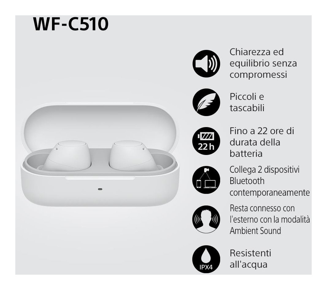 Ti presentiamo gli auricolari Sony WF-C510: incredibilmente comodi, con una fantastica qualità del suono e ricchi di funzionalità, questi sono tra i nostri auricolari più piccoli e leggeri di sempre!
