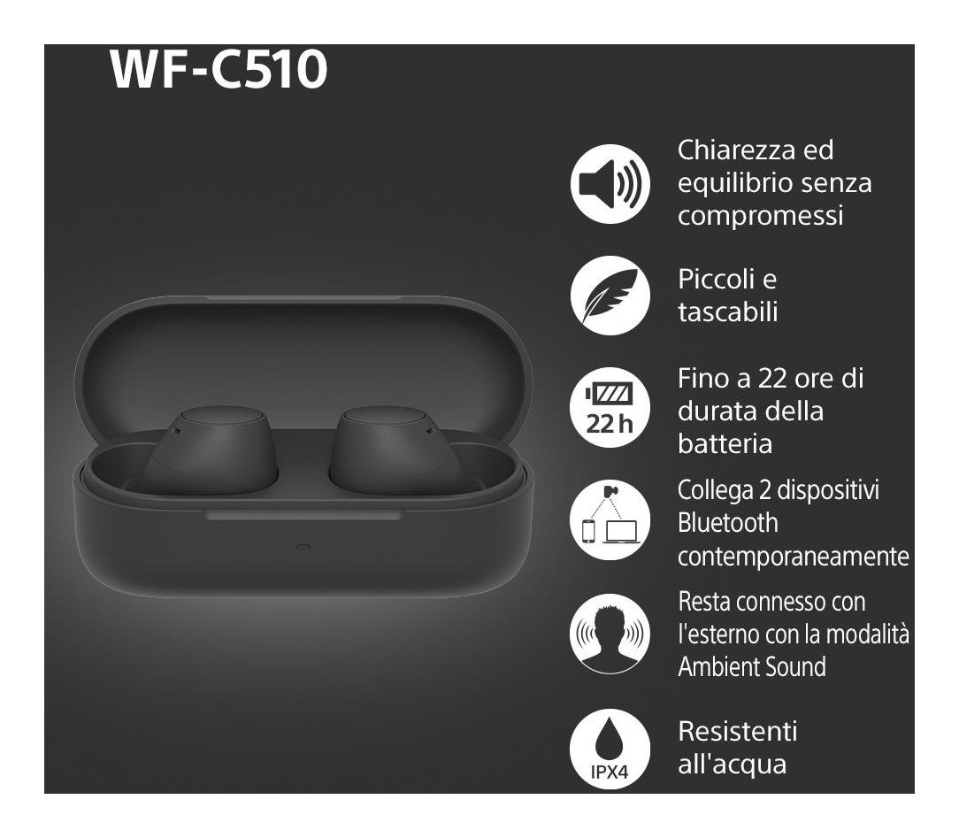 Ti presentiamo gli auricolari Sony WF-C510: incredibilmente comodi, con una fantastica qualità del suono e ricchi di funzionalità, questi sono tra i nostri auricolari più piccoli e leggeri di sempre!