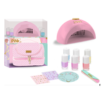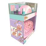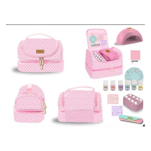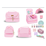 Set da vaiggio per nail art. Contiene: borsetta con pailette reversibili e tweed, asciugatore, 8 smalti, sticker e limetta per unghie.
