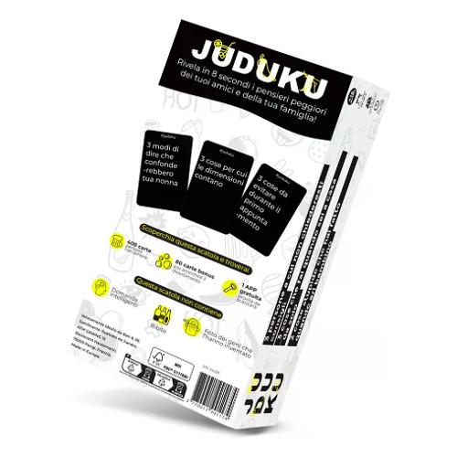 Juduku è un party game scorretto, in cui i giocatori si daranno battaglia a suon di risposte serrate. Ad ogni turno verranno infatti poste delle domande irriverenti e provocatorie, che dovranno ricevere risposta in non più di 8 secondi. Il poco tempo a propria disposizione sarà quindi l’elemento scatenante, grazie al quale potranno essere portate alla luce risposte imbarazzanti e ridicole. Il gioco sarà inoltre affiancato da una pratica applicazione che scandirà gli 8 secondi più importanti delle vite dei giocatori e che celerà al suo interno anche divertenti sorprese sonore che aumenteranno il coefficiente di divertimento di ogni turno di gioco.