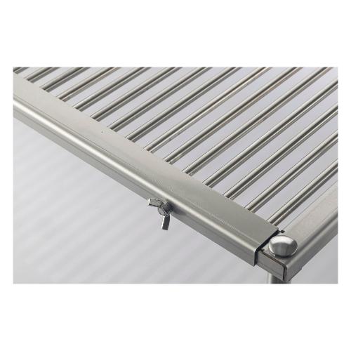 Griglia in pratico kit di montaggio realizzata con superficie cottura in tondino acciaio inox d.8 mm. Il kit comprende: 2 profili lato lungo, 2 profili lato corto con maniglia, 2 lamiere angolari superiori, viti e galletti fissaggio senza utensili, 4 gambe h. 11 cm e tondini griglia