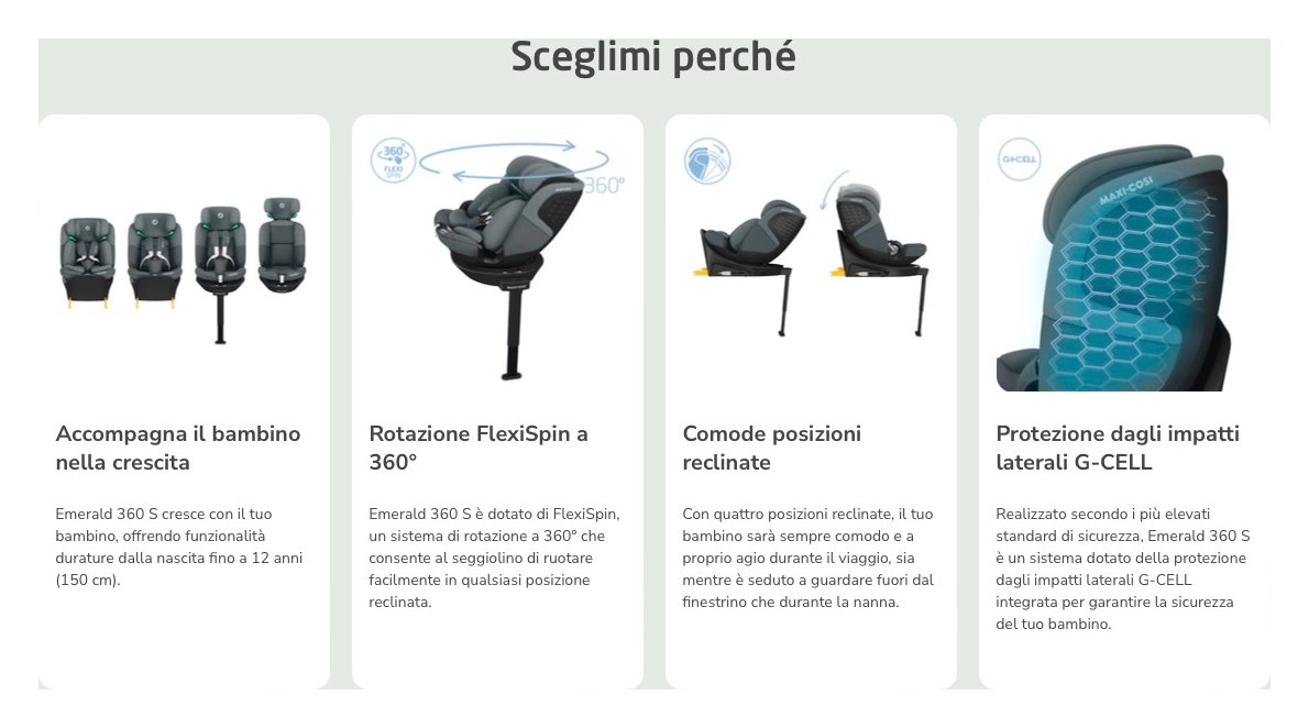 Emerald 360 s garantisce comfort e sicurezza duraturi, adattandosi alla crescita del tuo bambino dalla nascita fino a 12 anni (150 cm /36 kg) con la rotazione a 360° flexispin e quattro comode posizioni reclinate, emerald 360 s risponde alle esigenze della tua famiglia in ogni fase e in ogni avventura. Emerald 360 s non si limita a garantire un comfort prolungato al tuo piccolo, ma anche una sicurezza di lunga durata. È progettato in conformità al massimo e più recente standard di sicurezza per seggiolini auto, noto come i-Size. Oltre a ciò, il seggiolino integra la tecnologia di protezione dagli impatti laterali G-CELL, che assorbe l'urto derivante da un'eventuale collisione e lo disperde, allontanandolo dal corpo del tuo bambino.