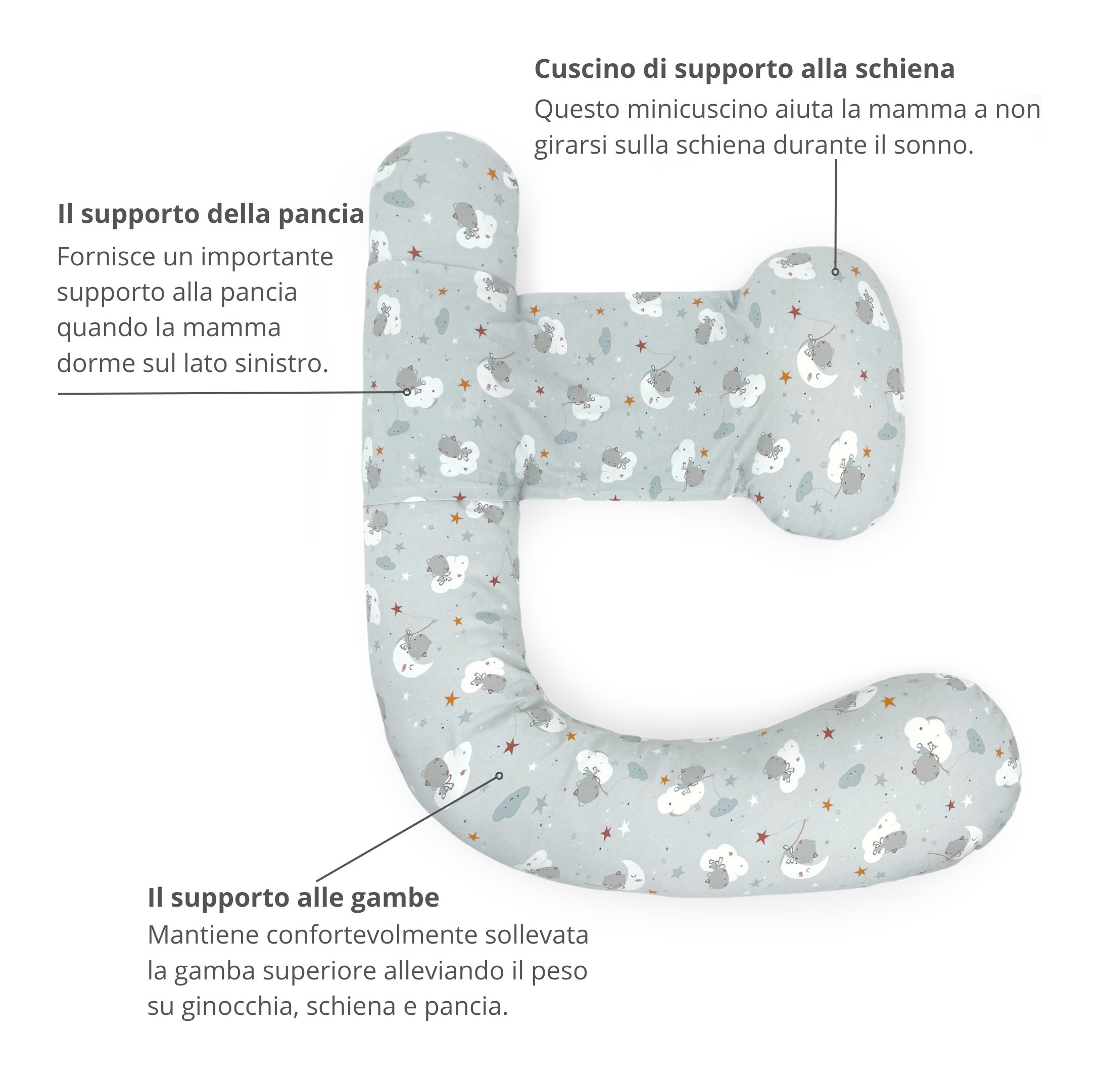 Polly è un cuscino per la gravidanza studiato per migliorare la salute e il comfort della mamma e del bambino. Ha un supporto regolabile per sostenere la schiena, la sua forma è indicata per sostenere pancia e ginocchia e favorisce il riposo e un corretto posizionamento