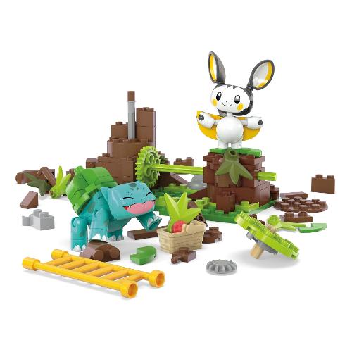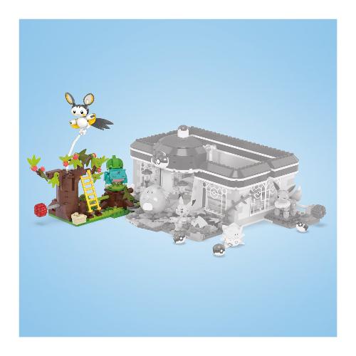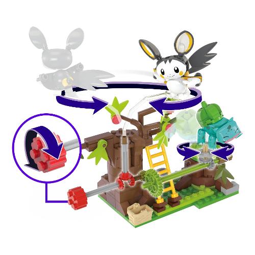 Prendi il volo e raccogli le bacche con questo set da costruzione con l'innovativo mattoncino movimento. Guarda emolga volare intorno a un albero di bacche mentre bulbasaur gira intorno in basso. Si combina con altri set mega per creare un mondo pokémon ancora più grande e dinamico. Ognuno in vendita separatamente. Include 2 pokémon snodati da costruire, emolga e bulbasaur