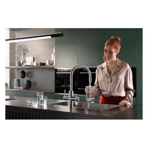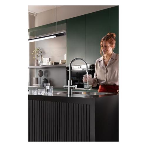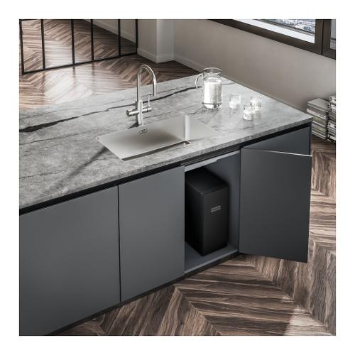Rubinetto multifunzione con starter kit mythos water hub sparkling con bocca fissa. Il sistema cucina 5in1 è una soluzione innovativa che fornisce l'accesso all'acqua corrente fredda, calda, filtrata, gassata e refrigerata. L'unità di refrigerazione, la bombola di co2 e il filtro con testata si trovano in un unico alloggiamento compatto, consentendo una facile installazione sotto il lavello. Il controllo elettronico con segnalazione led e un'applicazione mobile facilitano il funzionamento e il monitoraggio dei consumi. L'avanzato filtro pro m connect rimuove calcare, ruggine, cloro e contaminanti per un'acqua della massima qualità, mentre la tecnologia rfid assicura che il dispositivo franke ti invii una notifica quando il filtro deve essere sostituito. La cartuccia di co2 è facile da installare e sostituire, garantendo un accesso costante all'acqua gassata.