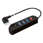 Presa multipla con spina “piccola” salvaspazio 10 a e interruttore di sicurezza. In caso di sovraccarico superiore ai 2300 w l’interruttore interviene in modo automatico togliendo l’alimentazione ai dispositivi collegati. Dopo pochi secondi agendo sempre sull’interruttore è possibile ripristinare l’alimentazione. Spegnendo l’interruttore è inoltre possibile risparmiare energia elettrica ed eliminare lo stand-by dei dispositivi elettronici. Le prese pluristandard consentono il collegamento di tutte le spine standard italiano e tedesco, essendo inoltre inclinate di 45° facilitano l’inserimento di più spine ingombranti (es. alimentatori).