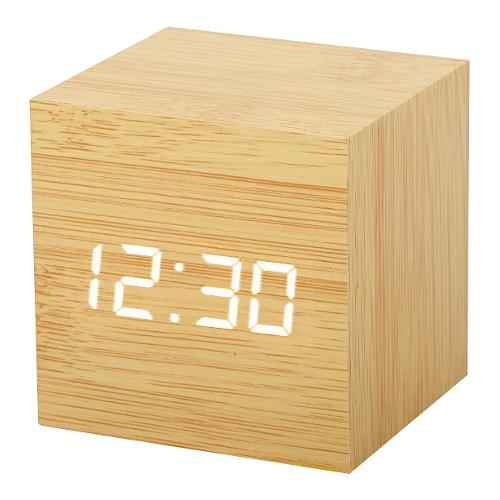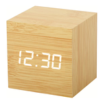 Sveglia digitale multifunzione con cassa in legno. Possibilità di visualizzare temperatura interna e calendario. Tre differenti allarmi regolabili. Diminuzione automatica dell’intensità del display oppure possibilità di regolazione manuale (4 livelli). Modalità “sound control” per il risparmio energetico. Cavo USB di ricarica in dotazione (alimentazione consigliata DC 5V/500 MA). Batteria tampone CR2032 (inclusa)