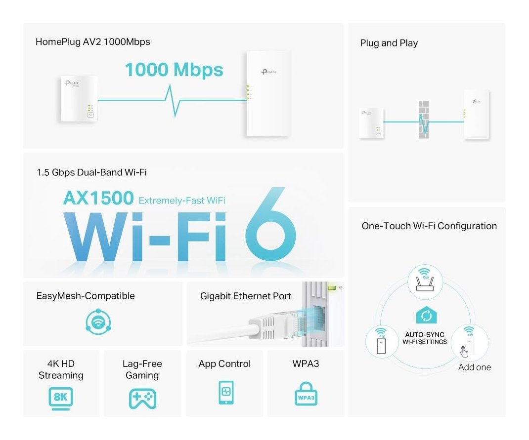 Estendi la rete Wi-Fi AX1500 e Gigabit in ogni stanza, utilizzando l'impianto elettrico.