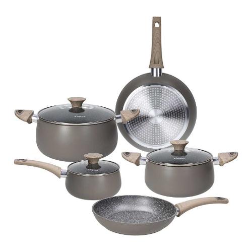 La batteria 8 pezzi della linea eco fa parte di una linea eco-friendly a basso impatto ambientale che unisce la qualità e la funzionalità ad un design vintage esclusivo. Del marchio "tognana" le pentole e padelle di questa batteria hanno un corpo in alluminio riciclato con rivestimento interno antiaderente marmorizzato a 4 strati; il fondo è ad alto spessore anti-deformazione e garantisce un'ottima distribuzione del calore, adatto anche all'induzione; i manici sono in bakelite soft touch effetto legno antiscivolo e antiscottatura, per una presa salda e sicura.