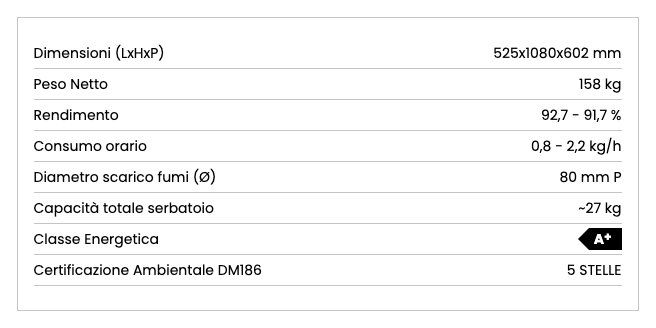 Con un design classico e lineare che si integra in qualsiasi ambiente, questo prodotto combina eleganza e praticità. Dotato di un ampio serbatoio da 27 kg e un vano cenere facile da gestire, offre un'eccezionale comodità d'uso. Inoltre, il motore indipendente per la canalizzazione assicura un'uscita termostatabile fino a 8 metri.