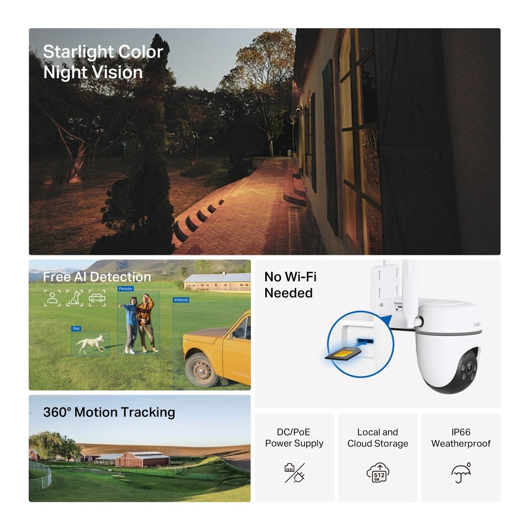 Connetti la tua telecamera alle reti 4G LTE, per installazione in luoghi in cui non è disponibile una connessione Wi-Fi stabile. L'intelligenza artificiale identifica persone, animali domestici e veicoli, inviando notifiche istantanee tramite l'app Tapo. Alimenta la tua videocamera con un adattatore DC o un cavo Ethernet dotato di tecnologia PoE.