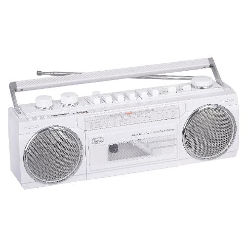 Oltre alle vecchie cassette a nastro, potrai collegare l'apparecchio con altri dispositivi come computer e telefoni. Il radio registratore ha la forma del classico boombox anni Ottanta lungo e rettangolare con maniglia di trasporto ed altoparlanti rotondi sui due lati. In dotazione include una radio a 4 bande con ricezione tramite antenna allungabile. Inoltre è fornito di ingresso USB/SD con il quale puoi ascoltare la tua musica in formato Mp3.