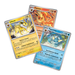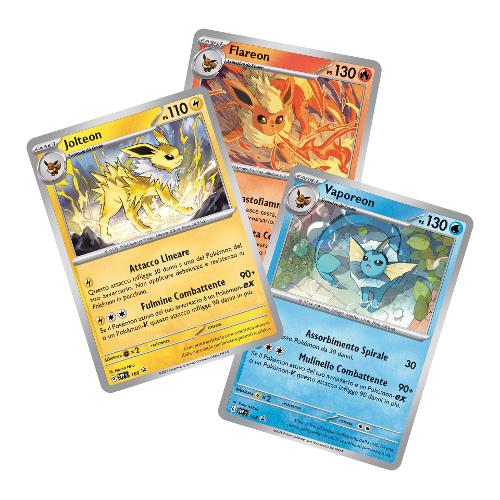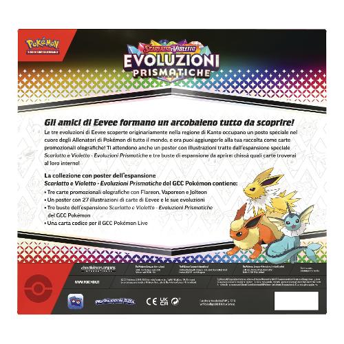 Le tre evoluzioni di Eevee scoperte originariamente nella regione di Kanto occupano un posto speciale nel cuore degli Allenatori di Pokémon di tutto il mondo, e ora puoi aggiungerle alla tua raccolta come carte promozionali olografiche! Ti attendono anche un poster con illustrazioni tratte dall'espansione speciale Scarlatto e Violetto - Evoluzioni Prismatiche e tre buste di espansione da aprire: chissà quali carte troverai al loro interno! La collezione con poster dell'espansione Scarlatto e Violetto - Evoluzioni Prismatiche del GCC Pokémon contiene: • Tre carte promozionali olografiche con Flareon, Vaporeon e Jolteon • Un poster con 27 illustrazioni di carte di Eevee e le sue evoluzioni • Tre buste dell'espansione Scarlatto e Violetto - Evoluzioni Prismatiche del GCC Pokémon • Una carta codice per il GCC Pokémon Live
