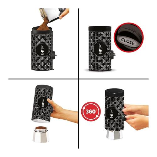 Sistema pratico per conservare e dosare il caffè per la tua moka solleva il tappo e riempi il carattolo con il caffè macinato per moka chiudi il tappo superiore, posiziona la manopola su close, e successivamente apri il tappo inferiore posiziona il barattolo sulla caldaia della moka(1-9 tazze) in modo che la base aderisca perfettamente effettua un gior completo della manopola e riposizionala su "close" prima di sollevare il barattolo dalla caldaia della moka.