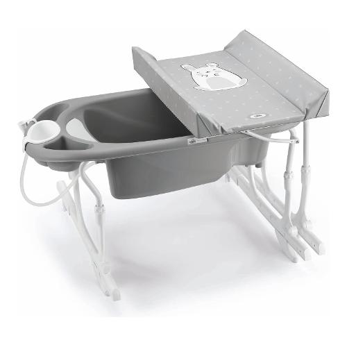 Made in italy e perfetto per vasche di forme particolari: morbido materassino estraibile imbottito su 2 lati, include vaschetta Baby Bagno con 2 sedute anatomiche e antiscivolo (una inclinata per bimbi da 0 a 6 mesi e una seduta con braccioli per bimbi da 6 a 12 mesi), vani portasapone e porta spugnette, doccino, piedini di supporto, tappo e tubo per scarico dell'acqua.