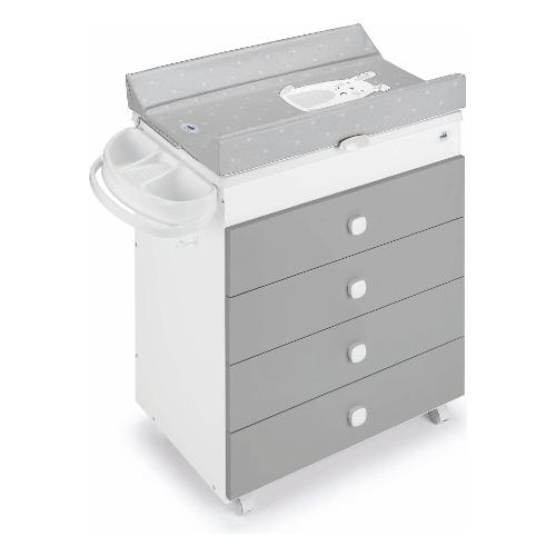 Cassettiera realizzata in italia con morbido fasciatoio con sistema di anti-ribaltamento; vaschetta con 2 sedute anatomiche (una inclinata per bimbi da 0 a 6 mesi e una seduta per bimbi da 6 a 12 mesi); vani portaoggetti e prta spugnetta, tappo e tubo per scarico dell'acqua, 4 cassetti con guide in metallo, 4 ruote di cui 2 con freno, coperchio in legno per funzione mobiletto.