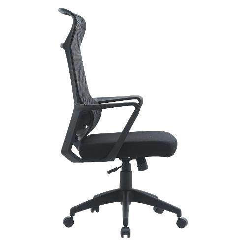 Base in nylon Ø 68 cm. Ruote in nylon. Seduta in compensato, imbottita in schiuma poliuretanica (densità 25kg/m3) e rivestita in tessuto Poliestere 100%. Schienale e poggiatesta in plastica (pp) rivestito in tessuto a rete Poliestere 100% con supporto lombare. Braccioli in plastica (pp). Regolazione dell'altezza con pistone a gas