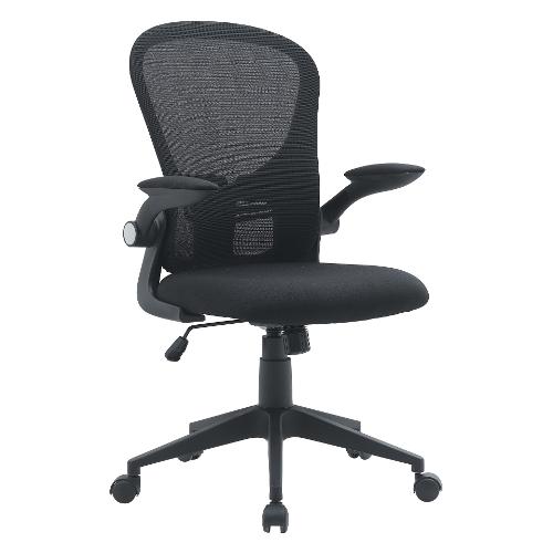 Base in nylon Ø 68 cm. Ruote in nylon. Seduta in compensato, imbottita in schiuma poliuretanica (densità 25kg/m3) e rivestita in tessuto Poliestere 100%. Schienale in plastica (pp) rivestito in tessuto a rete Poliestere 100% con supporto lombare. Braccioli ribaltabili in plastica (pp) rivestiti in tessuto Poliestere 100%. Regolazione dell'altezza con pistone a gas