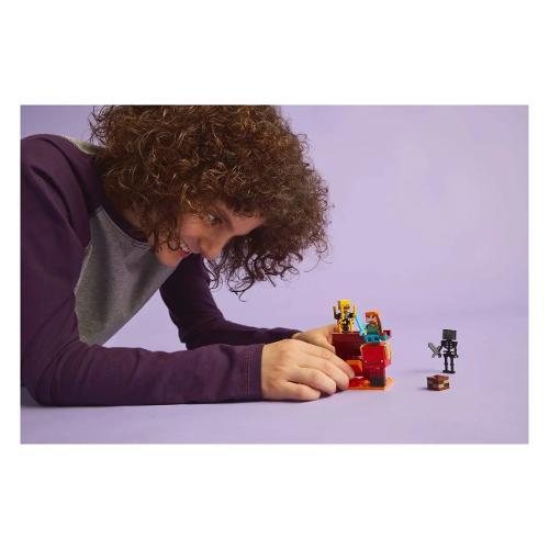 I bambini si uniscono ad alex, l’eroe d’azione di minecraft, nella sua missione: rimuovere antichi detriti da una sezione del ponte della fortezza del nether nella foresta cremisi.Quando I detriti vengono rimossi, gli elementi lava cadono automaticamente a cascata e le figure minecraft di uno scheletro wither, che brandisce una spada di pietra, e di un blaze, dotato di bastone rotante, bloccano la fuga di alex. I bambini usano l’iconica spada di diamante per combattere i mob prima di fuggire su un’altra figura di minecraft, uno strider dotato di gambe snodabili e di sella. I giocatori di minecraft sanno che devono afferrare un fungo deformato per poter guidare lo strider. Per un divertimento ancora più digitale, l’app lego builder consente ai bambini di ingrandire e ruotare i modelli in 3d utilizzando il proprio dispositivo.