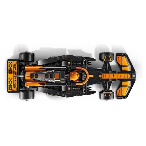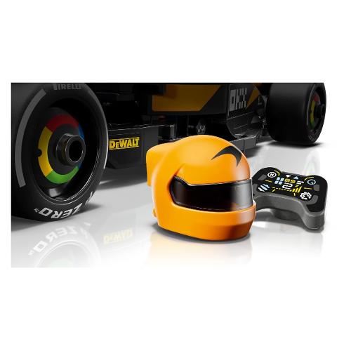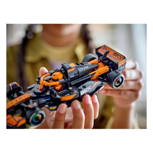 Il modello di auto di f1 è dotato di abitacolo che si apre sollevando la barra dell’halo, di ala posteriore, sospensioni a quadrilatero, adesivi degli sponsor e pneumatici posteriori più larghi con stampa “pirelli”. Il veicolo giocattolo contiene anche la minifigure del pilota con tuta mclaren e casco con ala, posizionabile nell’abitacolo per tanta azione competitiva.