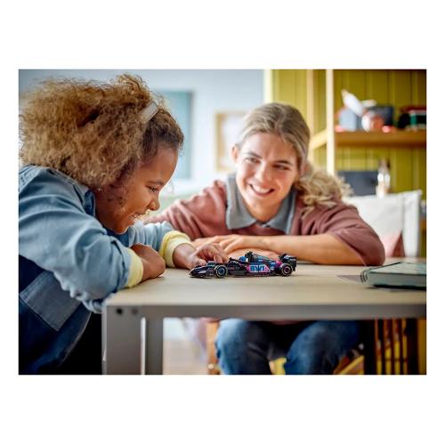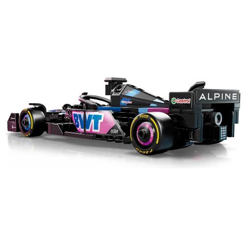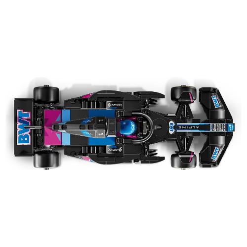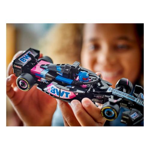 Il modello di auto di f1 è dotato di abitacolo che si apre sollevando la barra d ell’halo, di ala posteriore, sospensioni a quadrilatero, adesivi degli sponsor e pneumatici posteriori più larghi con stampa “pirelli”. L’auto da corsa contiene anche la minifigure del pilota con tuta alpine e casco con ala, posizionabile nell’abitacolo.