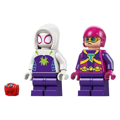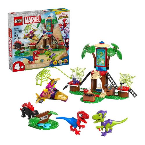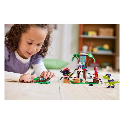 La casa sull’albero ha 3 piattaforme, di cui una con un grande schermo che mostra la missione della squadra. Ci sono le minifigure di trapster, ghost-spider e trace-e, oltre ai dinosauri costruibili di spidey-rex, gobby-raptor e dino-spin. L’aereo di trapster ha 2 shooter. Gli accessori includono grandi elementi ragnatela, diamanti rossi, uno scrigno del tesoro, una mappa del tesoro, una salsiccia, un uovo, una coscia di pollo, un binocolo e un’ascia. È inclusa una colorata guida illustrata con istruzioni intuitive. Buste separate contengono mattoncini e un grande starter brick per rendere la costruzione facile e veloce.