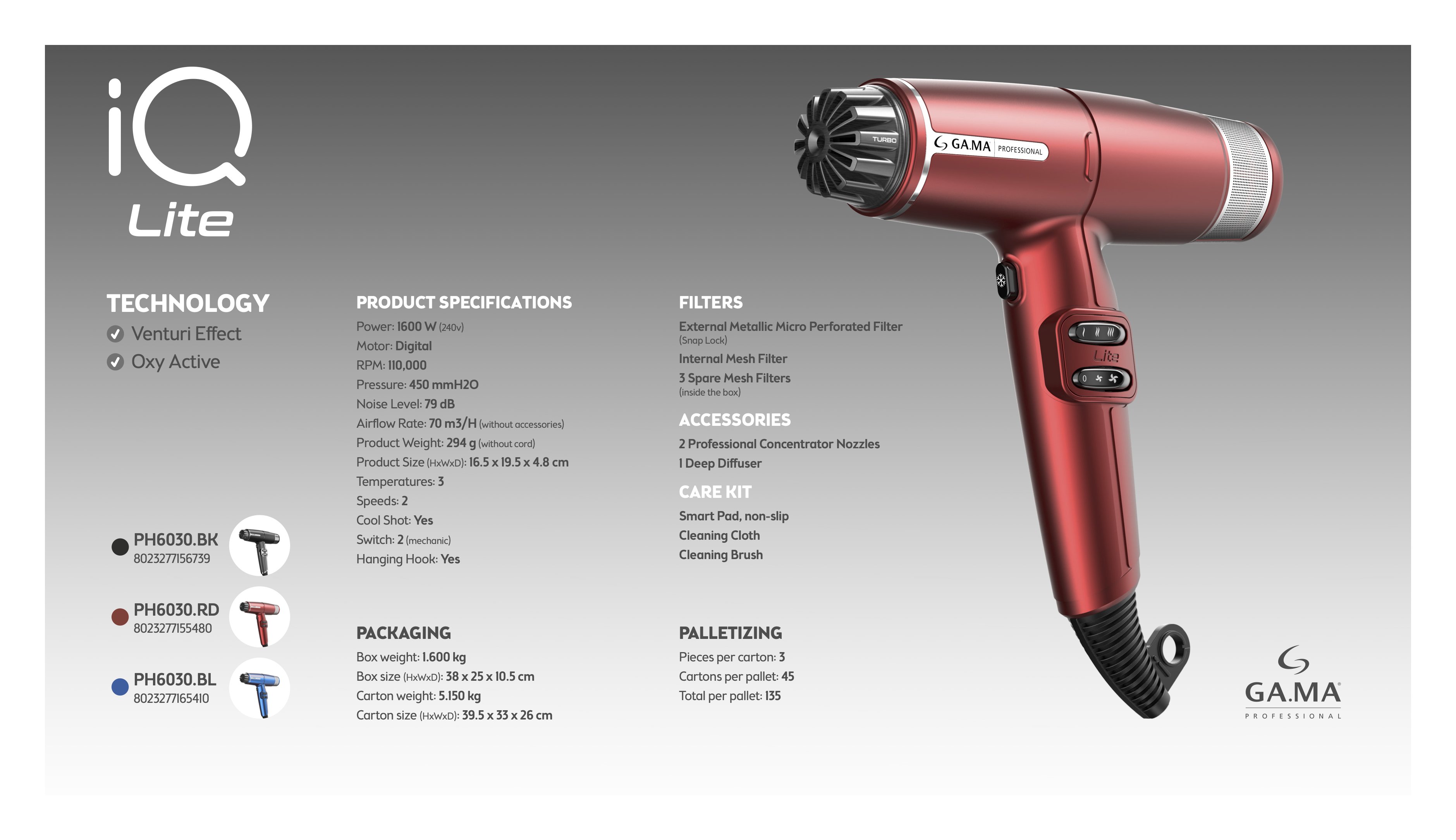 Il nuovo iQ Lite incorpora le caratteristiche essenziali di innovazione ed eccellenza della loro pluripremiata linea iQ Perfetto. Dal design italiano elegante ed ultracompatto, unisce leggerezza, soli 316 grammi, e potenza. È dotato di tecnologia Oxy-Active, che esalta la durata e la vivacità del colore: questa tecnologia garantisce capelli dall’aspetto sano, idratati, senza effetto crespo, lucenti e migliorati e permette di ottenere l’effetto Color Lock.