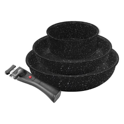 Set padelle 24 e 28 cm e casseruola 16 cm con unico manico dotate di rivestimento antiaderente resistente ai graffi, alle abrasioni. Testato per pfoa, nichel e metalli pesanti. Adatto a tutti i piani di cottura compreso l'induzione. La bolzano è una linea salva-spazio e multiuso. Risparmia spazio grazie alla perfetta impilabilità delle ciotole, tutte compatibili con un unico manico. Senza manico si può utilizzare in forno ad una temperatura massima di 230°