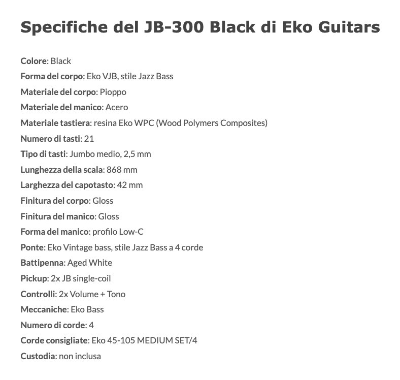 Il JB-300 Black è il basso elettrico 4 corde della serie "Tribute 300" di casa Eko Guitars. Ispirato al leggendario Jazz Bass e caratterizzato da hardware vintage, presenta corpo in Pioppo, manico in Acero e tastiera 21 tasti in resina Eko WPC. Monta due pickup JB con controlli separati di Volume e 1 tono. Ideale per il bassista che desidera uno strumento affidabile, versatile e performante.