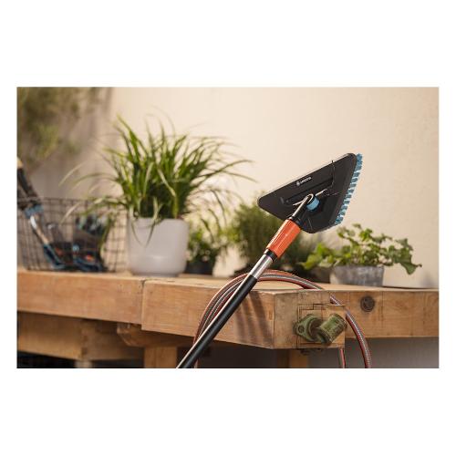 Grazie alla testa triangolare ruotabile a 360° con snodo flessibile, la spazzola arriva senza fatica anche negli angoli difficilmente accessibili ad altre spazzole. Si adatta quindi in modo ottimale alle superfici da pulire. L’idrospazzola si usa in combinazione con in manici ad acqua Cleansystem (art. 18000, 18002, 18804) ed è molto efficace nella pulizia di varie superfici. Per la pulizia dei pavimenti, si consiglia il manico ad acqua Cleansystem M (art. 18802). Lo shampoo GARDENA (art. 1680) aumenta ulteriormente l’efficacia dell’idrospazzola. Basta inserire il detergente nell’apposito erogatore situato sul manico. Il dosaggio avviene in modo ottimale in base alle necessità, consentendo una pulizia intensiva della superficie.