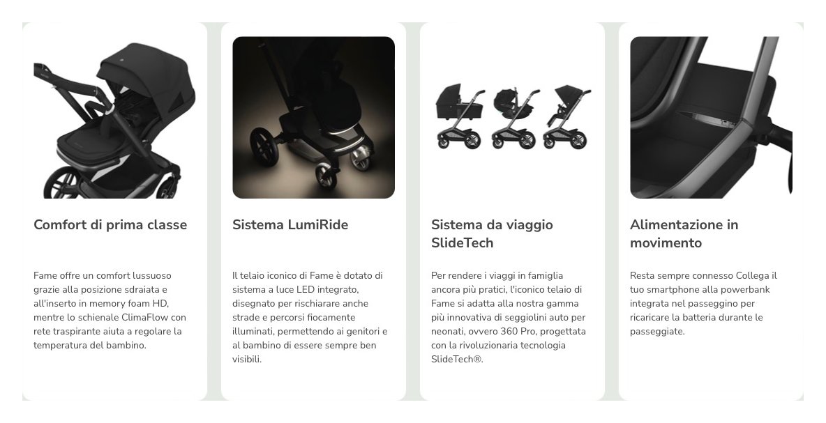 Un'icona di design del futuro. Iconico e avveniristico, il nuovo maxi-cosi fame è progettato per offrire massimo comfort a bambini e genitori. I preziosi dettagli, il design elegante, l'estetica moderna e le funzionalità innovative rendono fame un passeggino a prova di futuro. Un passeggino all'avanguardia per accompagnare le famiglie moderne nel futuro. La seduta ergonomica di fame offre uno spazio lussuoso per il tuo bambino, dove potrà dormire in posizione sdraiata o stare seduto e godersi il viaggio. La seduta è dotata di una morbida imbottitura e di una rete climaflow per una regolazione ottimale della temperatura, in modo che il tuo piccolo stia comodo tutto l'anno. L'ampia capottina estensibile upf 50+ offre la massima protezione dal sole per il bambino e una finestra di ventilazione. Sistemare il bambino nel passeggino non è mai stato così facile grazie alle cinture easy-in di fame, che mantengono le cinture aperte e posizionate lateralmente. La fibbia magnetica a chiusura rapida rende l'installazione ancora più semplice e veloce. Fame dispone di un'ampia gamma di vani portaoggetti per avere tutto quello che ti serve a portata di mano, mentre con i pulsanti memory puoi invertire la seduta facilmente. Fame è ricco di elementi innovativi che semplificano la vita quotidiana ai genitori e ogni viaggio più confortevole per il bambino. Grazie alle ruote all-terrain e alle sospensioni cosicruise, il comfort del tuo piccolo non diminuirà, ovunque andrete. E per i genitori, la pratica chiusura compatta gli rende la vita più semplice. Fame è dotato di un sistema lumiride che illumina il percorso davanti a te e mantiene sia te che il tuo piccolo sicuri e visibili anche al buio. E c'è anche una powerbank integrata per mantenere carico il telefono anche in viaggio. Il telaio iconico di fame consente l'aggancio della nostra gamma di seggiolini auto per neonati più innovativa. I nostri seggiolini auto 360 pro, progettati con la rivoluzionaria tecnologia slidetech®, si agganciano semplicemente al telaio aerodinamico di fame. La rivoluzionaria tecnologia scorrevole del seggiolino è stata progettata per rendere ogni giorno più facile. Basta con i mal di schiena, i colpi alla testa o le difficoltà a far salire e scendere il tuo bambino dall'auto: è sufficiente agganciare, fare scorrere, girare e si è pronti a partire! Con il travel system slidetech® potrai esplorare il mondo insieme al tuo bambino, dalla nascita fino a 4 anni (22 kg).