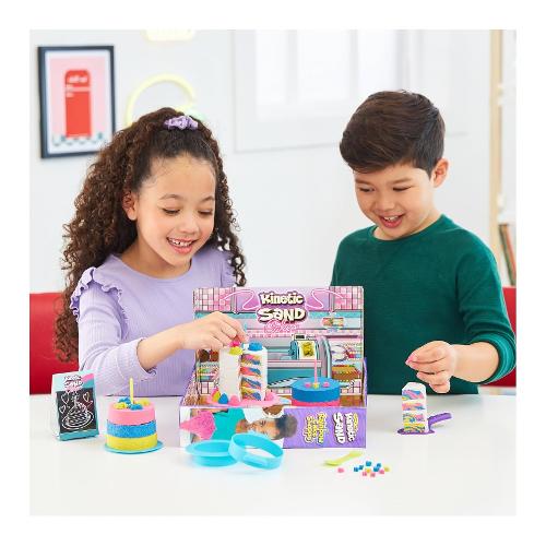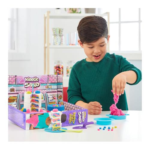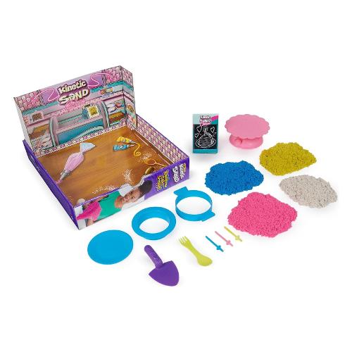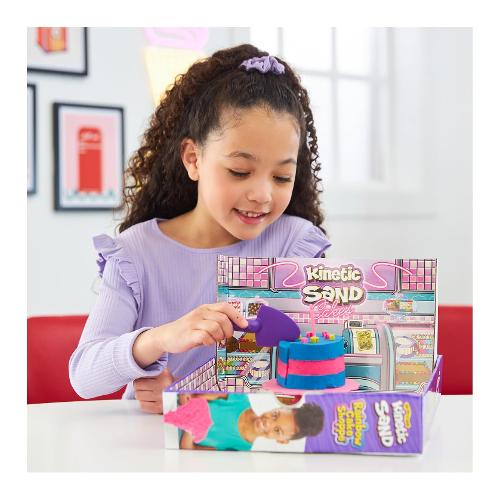 Scopri la magia del gioco ispirato a una panetteria con Rainbow Cake Shoppe di Kinetic Sand. Questo delizioso set offre un'esperienza pratica per i bambini per creare le proprie torte Kinetic Sand profumate e colorate attraverso un gioco sensoriale divertente e fantasioso. Con 680 g di Kinetic Sand colorato e modellabile in giallo, rosa, blu e bianco con aroma di vaniglia, i bambini possono creare deliziosi strati di pastello, mescolare i colori e godersi ore di gioco tattile. Il set comprende 10 accessori e utensili da cucina. Kinetic Sand è 99% sabbia naturale e 1% magia. Kinetic Sand è atossico, ipoallergenico e giocare con esso è sicuro. La sabbia magica colorata Kinetic Sand, può essere utilizzata sia all'interno che all'esterno.