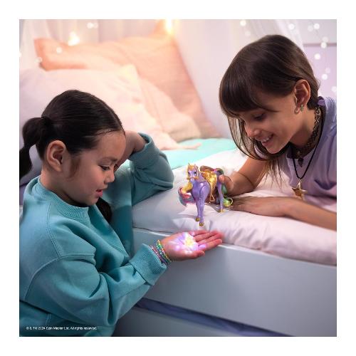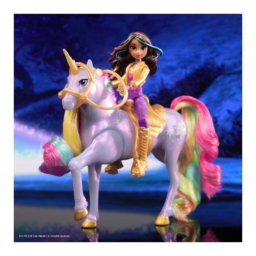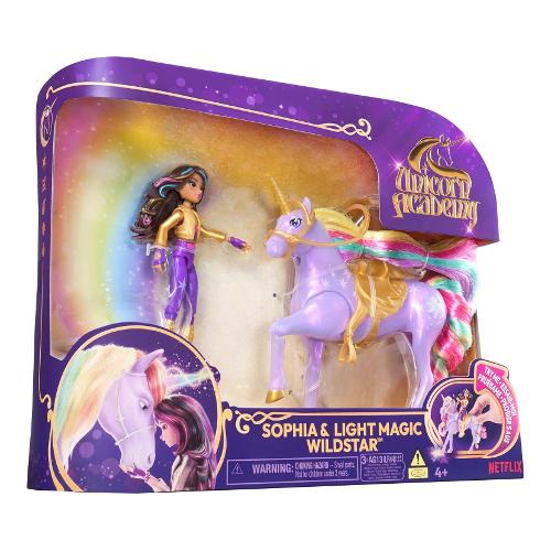 Ricrea il magico legame tra sophia & wildstar con vere luci arcobaleno. Premi il tasto contrassegnato dalla stella su wildstar per farle battere lo zoccolo e creare un effetto di luce arcobaleno indimenticabile, proprio come nella serie. Con dettagli fedeli al personaggio del cartone e 7 punti di articolazione, sophia può essere posizionata in groppa a wildstar per avventure senza fine. La sella e la briglia sono rimovibili; espandi la tua collezione unicorn academy con bambole, unicorni, bamboline, animali di peluche e molto altro ancora. Include: 1 bambola, 1 unicorno, 2 accessori rimovibili (briglia e sella), 1 guida per l'uso